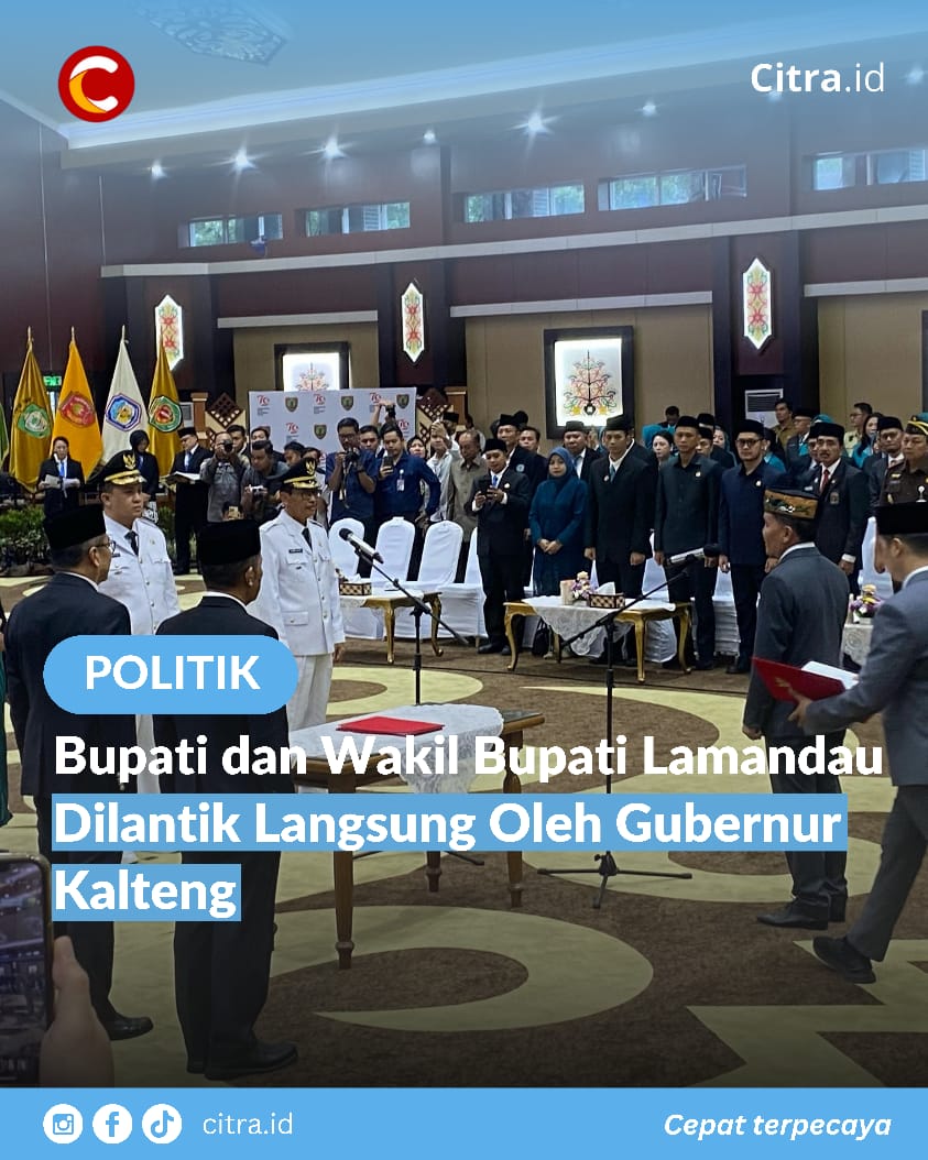 Palangka Raya, 24 Maret 2025 – Rizky Aditya Putra, S.E., M.M., dan Abdul Hamid resmi dilantik sebagai Bupati dan Wakil Bupati Lamandau periode 2025-2030 oleh Gubernur Kalimantan Tengah, H. Agustiar Sabran. Prosesi pelantikan berlangsung di Aula Jayang Tingang, Kantor Gubernur Kalimantan Tengah, dengan dihadiri sejumlah pejabat pemerintah, tokoh masyarakat, dan tamu undangan lainnya.